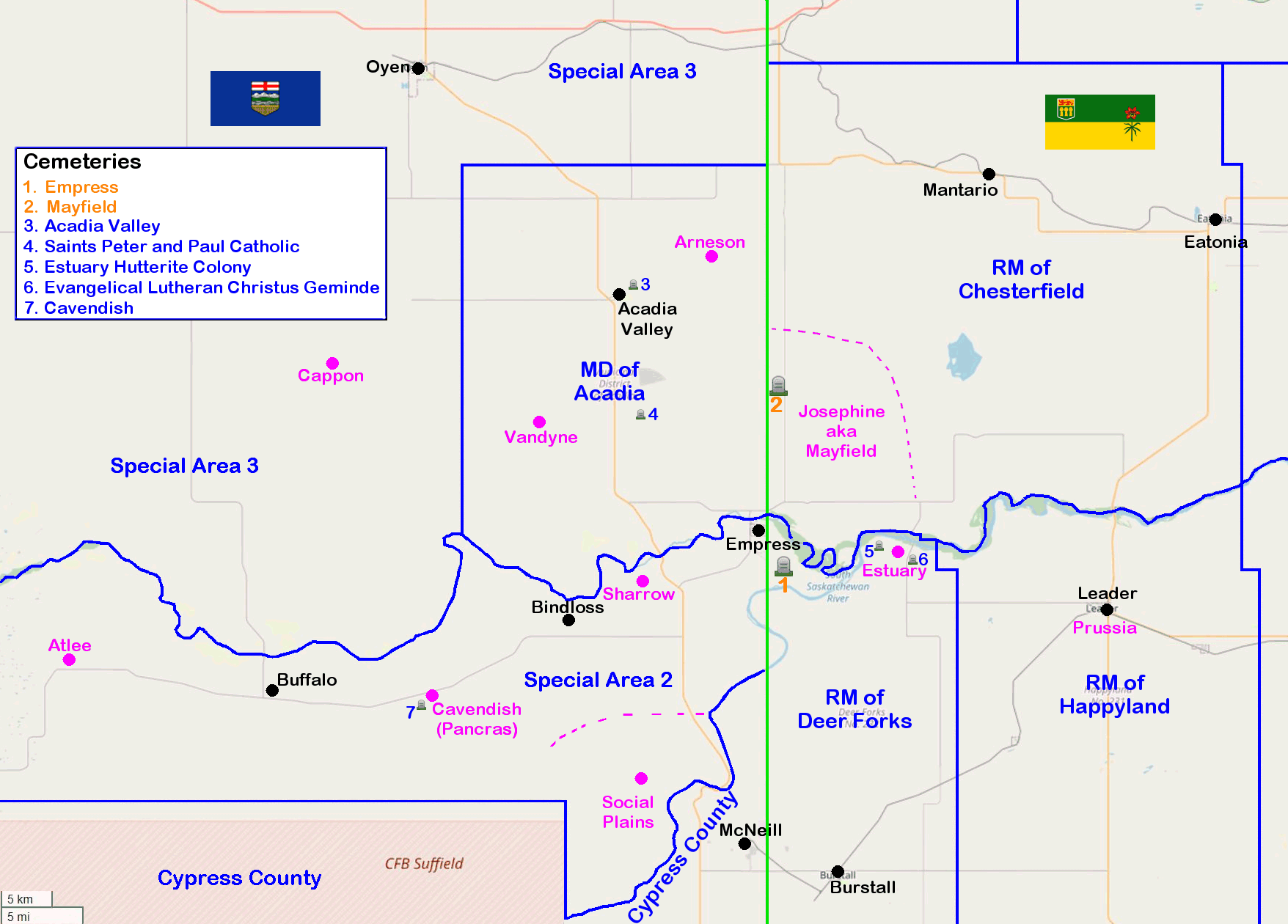 | Cavendish, AB (aka Pancras) | 50.8155556, -110.4552778 | CGNDB | Wikipedia | Map #54A (page 7) |